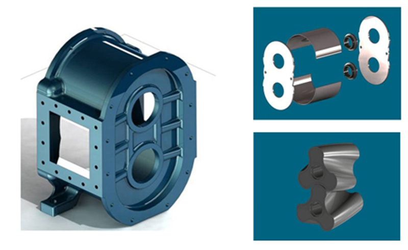 凸輪轉子泵屬于容積泵,有兩個相向旋轉的轉子安裝于平行的同步齒輪軸上,轉子與泵殼之間不斷形成小的腔體,填充在腔體內的介質不斷被旋轉的轉子由進口端推到出口端。